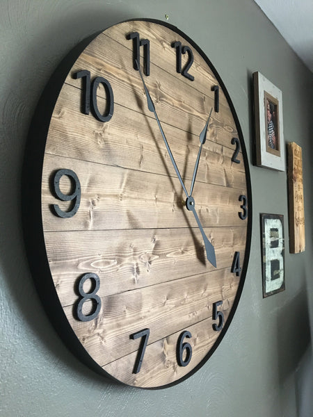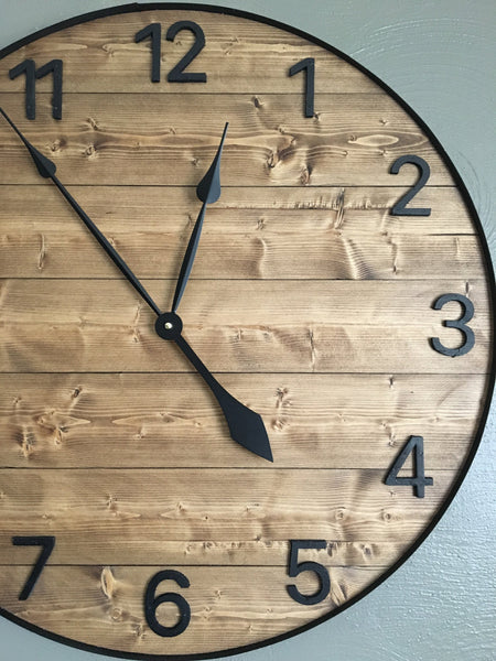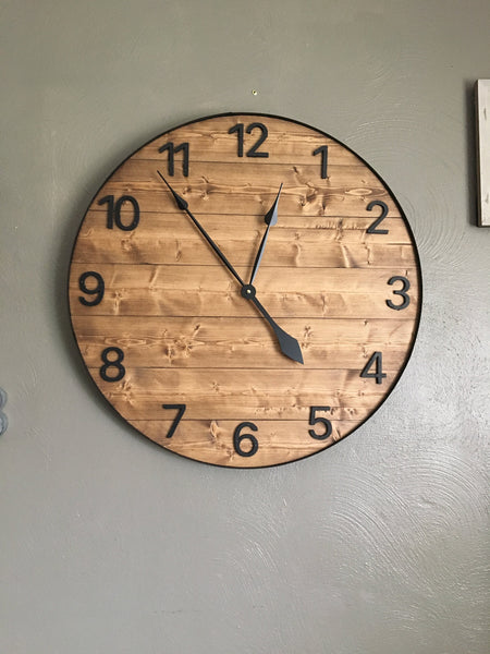 This is a large farmhouse style wall clock. The clock comes standard with traditional 1-12 numbers hand cut from wood and painted a flat black to match the metal ring around the outside of the clock. The wood is stained with a walnut stain which can be changed at no additional charge.