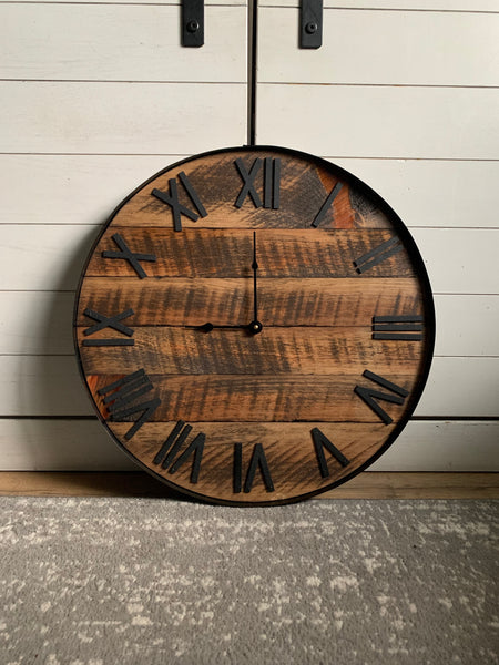 Rustic style clock with rough cut boards. Wooden Roman Numerals are painted black to match the hands and the black metal banding around the outside of the clock.